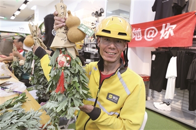 “之前端午节都是包些粽子,这是第一次体验制作艾草花束,既有趣又有意义。”参加活动的快递员小李说。在丰台南苑街道槐房万达广场党群服务站,这里组织开展了“艾香传情,粽意端午”主题手工活动,吸引了新就业形态劳动者群体、志愿服务队和小朋友们的参与。活动现场,工作人员讲解了艾草菖蒲花束的制作方法和技巧。在亲手体验环节,大家将新鲜艾草、菖蒲叶等花材巧妙组合,再用五彩丝线和端午主题挂饰进行捆扎装饰,寓意着吉祥安康,整个活动欢声笑语不断。