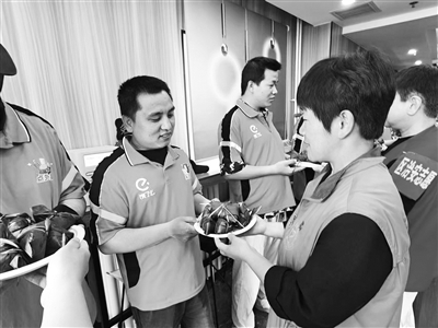 在红庙消防救援站,全国劳动模范梁会兰与志愿者、消防队员带着自己制作的粽子,前往中福秋果酒店全时驿站,慰问正在这里休息的快递员、外卖配送员。据悉,自2023年3月推行“移动网格员”计划以来,多名快递员、外卖配送员依托职业优势,参与“安心巡查”“贴心反馈”等“五心服务”工程,成为社区治理的“流动哨兵”。“平时为社区居民服务,今天收到社区的关怀,特别幸福。”外卖配送员臧师傅表示。