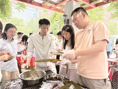 近日,来广营地区总工会在朝来科技产业园区举办职工嘉年华活动,活动融合传统民俗体验、趣味竞技、公益互动等环节,吸引该园区300余名职工参与。在“粽香传情”区,园区食堂包粽子能手现场示范传统粽子制作技艺,职工积极参与其中,创意制作“迷你粽”“五角星粽”等个性化粽子。活动特别设置“职工入会”专区,为参加活动的职工现场提供工会服务。本报记者 刘欣欣 摄影报道