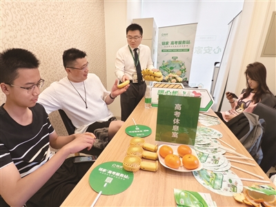 记者昨天在北京链家皂君庙一店看到,这是距离北京交通大学附属中学(北校区)考点最近的门店,该门店“中高考服务站——欢迎考生和家长进店休息”横幅格外醒目。店内,考试文具码放整齐,“金榜题名”“未来可期”等祝福牌挂在墙上。此外,该门店还为考生和家长准备了藿香正气合剂、清凉油等消暑物品。