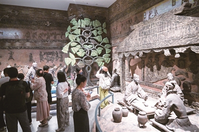 展厅中展示的辽代砖石墓和金代壁画墓,吸引了不少人驻足。辽代砖石墓和金代壁画墓由原址整体迁移进入展厅,展现了辽、金时期路县故城遗址的人文风貌。