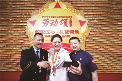 6月18日,庆祝中华全国总工会成立100周年“劳动颂”主题展嘉宾开放日活动在太庙艺术馆举办。本次展览由北京市总工会、中央美术学院主办,北京市劳动人民文化宫(太庙艺术馆)、北京职工书画协会承办,中国艺术研究院写意画院支持。展览包括位于太庙寝殿的 “致敬匠心 礼赞劳动 —— 劳模主题写生创作展”,以及位于太庙享殿西配殿的“繁花绘韵 岁月华章——主题创作展”和东配殿的“匠心独运 京艺华彩——北京工匠工艺美术作品展”。图为劳模工匠代表在展览现场自拍合影。