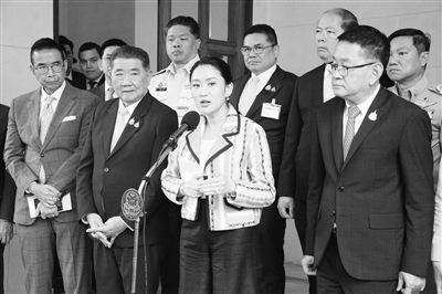 近期,因边界争端导致泰柬边境紧张局势加剧。22日,柬埔寨宣布禁止从泰国进口燃油和天然气,并建议柬公民避免前往泰国。图为泰国总理佩通坦(前排右二)在位于曼谷的总理府出席新闻发布会。