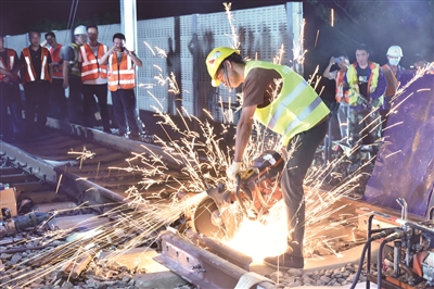 据中国铁路北京局京南工程项目管理部相关负责人介绍,雄安枢纽工程包括新建米宁庄线路所,新建津九上、下行联络线,京雄商(京雄段)高铁上跨津九上行联络线特大桥以及雄安动车所改扩建等重点施工项目。此次插入的42号道岔位于新建的米宁庄线路所,总长157.2米,重达232吨,全部采用闪光焊方式焊接,较传统铝热焊工艺,闪光焊的焊接强度明显提升,钢轨的稳定性更高,这也是钢轨焊接新工艺的一次成功实践。