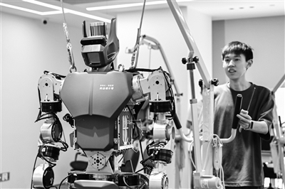 近年来,湖北省加快布局人形机器人领域,依托省内高校院所的人才优势和创新体系优势,组织武汉大学、华中科技大学等参与人形机器人相关项目研发,集中推出“天问”“劳动者”“荆楚”等一系列人形机器人。其中,一批青年人才成为研发团队中的骨干力量,从在读硕士、博士到博士后,他们不仅是人形机器人技术突破的执行者,还推动实验室成果与企业需求对接,发挥出新生代科研力量的向“新”力。图为华中科技大学硕士研究生林韦弦在武汉格蓝若智能技术股份有限公司启动“劳动者”系列人形机器人。新华社发