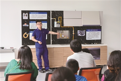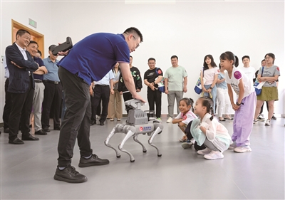 活动开场,由职工们自编自演的相声《燃气安全》、诗朗诵《守护者日记》等文艺节目点燃现场气氛,充分展现北京燃气集团职工昂扬向上的精神风貌。随后,职工家庭分组走进教学楼的各教室,沉浸式体验燃气行业业务场景。在“巡检精灵知多少”活动区,一只行动敏捷的机器狗时而行走、时而招手,瞬间吸引了孩子们的目光。现场工作人员介绍,这是专门为社区燃气巡检场景量身定制的智能巡检机器人,可深入社区稳定执行安全巡检任务,大幅提升巡检效率。在“街边安全守望者”活动区,4名一线职工对有限空间作业进行展演,讲解防爆手电、全身式安全带等装备的作用。“当作业人员在井下遇到险情无法自身脱离危险环境时,我们需要立刻在井上穿戴正压式呼吸器开展下井救援。”工作人员边说边协助一名孩子体验穿戴井下救援设备。在“厨房里的燃气安全”活动区,孩子们依托实物教具,更直观地学习燃气表读数识别、燃气泄漏应急处理方法。“燃气安全职业萌像手绘”活动区内,大家以家庭为单位绘制燃气职工的卡通形象。“通过这次活动,我认识了厨房中的智能物联网燃气表和燃气自闭阀,很有收获!”一位小朋友说。