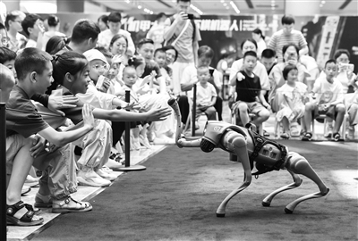 7月6日,浙江省金华市金华之光文化广场科技馆举办AI智能机器人科普展,吸引了许多家长带着小朋友与人形机器人、智能机器狗、下棋机器人、足球机器人等互动,沉浸式感受人工智能技术的魅力,乐享暑期生活。图为小朋友与智能机器狗互动。 新华社发