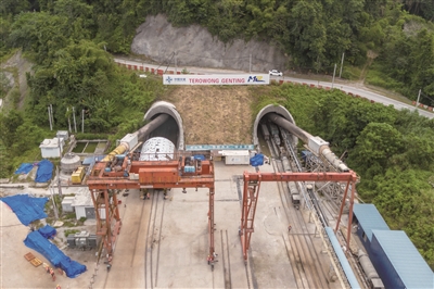 马东铁项目是中马两国共建“一带一路”合作的旗舰项目,设计全长600多公里。图为在马来西亚彭亨州拍摄的马来西亚东海岸铁路(马东铁)项目云顶隧道口(无人机照片)。