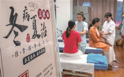 7月20日是入伏第一天,各地群众通过艾灸、拔罐、贴“三伏贴”等中医疗法进行“冬病夏治”,增强身体抵抗力。图为中医师在给市民贴“三伏贴”。