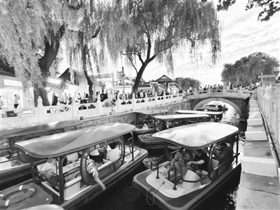 昨天傍晚,记者在什刹海景区看到,商户纷纷延长营业时间,开启超长“待机”模式,以满足游客欣赏什刹海夜色的需求。同时,银桥下游船穿梭往来,为了避免“堵船”发生,分别在桥洞两边派专人负责“疏散交通”。月色下,各家商户的灯光逐渐亮起来,将前海、后海勾勒得旖旎动人。