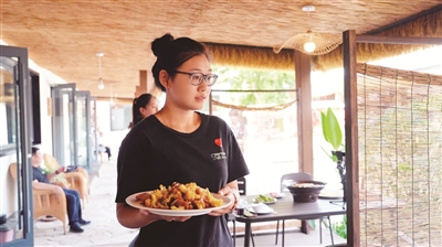 陪着客人乘摆渡车前往印象餐区,推荐密云水库鱼不同烹饪方法的各个风味,介绍户外餐区非遗漏粉体验项目……冯思佳专业又热情的服务,与密云印象云溪民宿“家”的烟火气相辅相融。