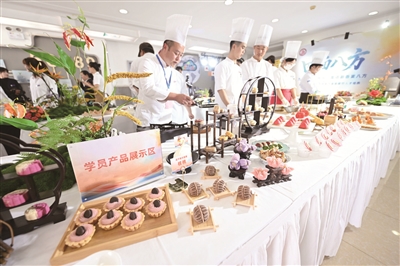 当天,还为首都工匠学院开展的中式面点高技能人才培训班举行结业仪式,50名学员以成果展示的形式,完成了为期两个月的学习之旅。展台上,学员们用银耳羹、南瓜仿制鸡蛋液,以昌平苹果为馅料做成甜品苹果酥,选用妙峰山玫瑰做出咯吱盒……来自北京9个区的面点精英,直观呈现出中式面点技艺的精湛水准。