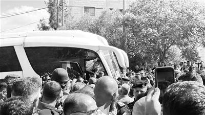 亲人们终于归来,可他们的国,又在何方?图为在约旦河西岸城市拉姆安拉,国际红十字会的大巴载着巴勒斯坦获释人员抵达拉姆安拉文化馆(手机照片)。据新华社