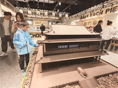 近日,京城文化新地标北京坊里开了一间巧克力店,把美味的巧克力做成了艺术品。记者在该店看到,一个来福萌兽作为“门童”迎接客人,在它身后是一组气势恢宏的古建,这些精美的“艺术品”全部用纯黑巧克力并利用3D技术与手工结合制作而成。