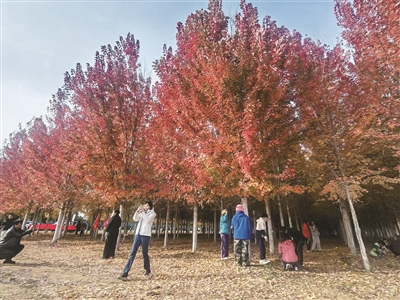 随着气温急速下降,今秋京郊的红叶变红的时间比往年提前了。上个周末,延庆区永新堡村数百亩枫叶林已经一片火红,吸引了众多市民与游客前来赏红。游人们徜徉在火红的枫叶林中,拍照打卡、自由赏玩,享受金秋的快乐。本报记者 王辰阳 摄影报道