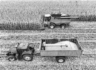 目前,内蒙古通辽市今年种植的近2000万亩玉米收获已过半,田间地头一派忙碌景象。图为在通辽市科尔沁区敖力布皋镇,农机手驾驶收割机收割玉米(无人机照片)。 新华社发