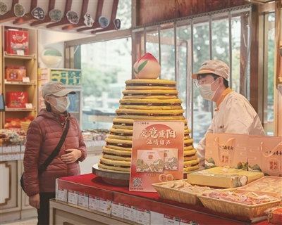 重阳将至,北京稻香村门店内的重阳花糕系列产品已上市。据了解,北京稻香村的重阳花糕延续了传统工艺,选用青梅、山楂糕、核桃仁与桃脯作为果料。同时,北京稻香村还创新推出了糖醇花糕,以糖醇桃脯、糖醇山楂糕与核桃等为原料,使节令食品更契合人们的健康饮食需求。本报记者 孙妍 摄影报道