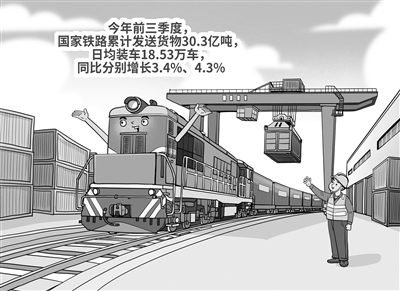 记者从中国国家铁路集团有限公司获悉,今年前三季度,国家铁路累计发送货物30.3亿吨,日均装车18.53万车,同比分别增长3.4%、4.3%,铁路物流产品持续优化升级,运输组织更加畅通高效,为助力降低全社会物流成本、畅通国内国际双循环、保障国民经济平稳运行提供了有力支撑。(10月23日 新华社)□朱慧卿