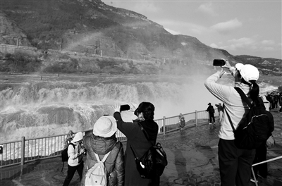 近日,位于山西吉县和陕西宜川县交界的黄河壶口瀑布景区天气晴好,飞溅的水雾在阳光照射下,形成一道壮美的“彩虹桥”。新华社发