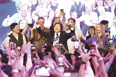 据阿根廷国家选举委员会近日公布的98.9%选票的计票结果,经过当天举行的中期选举,阿根廷总统米莱领导的执政联盟“自由前进党”在国会获得了更多议席数,取得胜利。图为阿根廷总统米莱(后中)在布宜诺斯艾利斯庆祝其领导的执政联盟“自由前进党”赢得国会中期选举。 新华社发