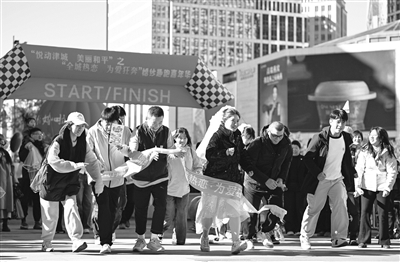 近日,由天津市和平区民政局主办的“悦动津城·美丽和平” 之 “全城热恋·为爱狂奔”婚纱趣跑嘉年华活动在和平区金街步行街举行,吸引了数十对情侣参加。图为参加活动的情侣在婚纱趣跑比赛中起跑。新华社发
