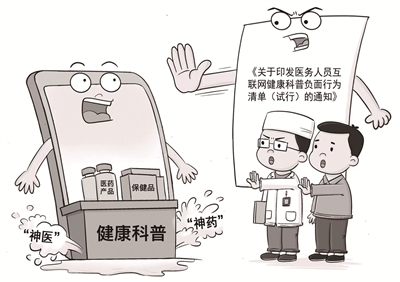 不得以健康科普形式违法违规发布各类广告、导流导诊,或通过直播带货等形式推销和销售医药产品、养生课程、保健食品等牟利;不得夸大病情和疾病治疗效果,不得以“神医”“神药”名义进行宣传……国家卫生健康委等三部门11月7日发布通知,针对医务人员互联网健康科普行为提出十条负面行为清单。(11月7日 新华社)
