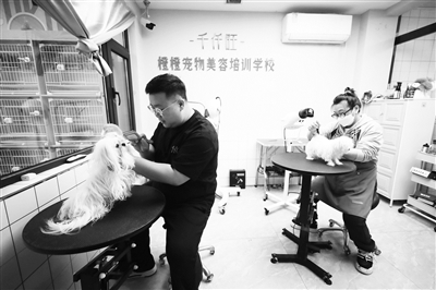 近年来,辽宁省鞍山市聚焦宠物经济,形成宠物箱包制造、食品加工、洗护美容等协同发展的特色产业集群,为这座传统工业城市增添新的产业活力。图为在鞍山市铁西区一家宠物销售公司开设的宠物美容培训学校,工作人员在梳理宠物狗毛发。新华社发