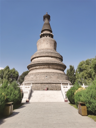 塔身为圆形覆钵,这种形式是外来品,有说是仿自印度僧人生活中常用的储水瓶而来,有说是模仿僧人作禅修行时的草庐或穹窿顶洞窟,通俗讲像半球形,类似倒扣的饭碗。绕塔时发现,塔座四个方位都各设一个神龛放置佛像。塔刹分刹座、相轮、伞盖和宝珠,刹座为须弥式、叠涩砌筑,平面呈“亞”字形,座中心矗立1根铁质刹杆。砌相轮13层,元代造10层,清代修葺时加盖3层,喻示佛教13天,下粗上细,收分自如。相轮上置圆形露盘,周悬金铎,状若伞盖,雄浑华。极顶以葫芦式宝珠两枚和圆形宝珠两枚收刹,四枚宝珠上下叠置而连成一线,均以刹杆串联并且支撑,造型秀美,雄健挺拔。