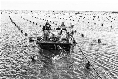 眼下,山东省荣成市海带播苗作业全面展开,养殖工人们抓紧时间进行夹苗、播苗等作业。图为在山东省荣成市爱伦湾海带养殖区,工人进行海带播苗作业(无人机照片)。新华社发