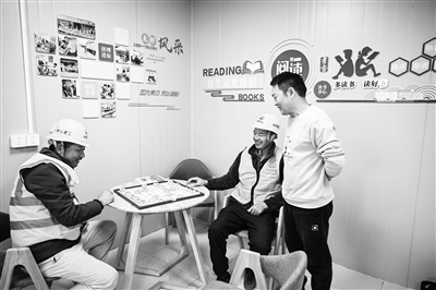 今年2月,江苏苏州北站综合枢纽工程正式开工。为更好服务城市建设者,给他们提供安居场所,苏州市相城区联合建设单位打造苏州北站新时代建筑工人社区。据悉,该社区总占地200余亩,已建成5个项目片区、1个综合服务中心、1个流动摊贩引导点和商业配套。社区内部集中设置卫生服务站、警务室、安“薪”驿站、矛盾调解室、法律服务室等公共服务设施,并实行物业统一管理服务,努力将社区打造成工人的幸福家园。目前,中铁北京局、中铁建工、中建八局等单位的3000余名工人已顺利入住。图为工人在苏州北站新时代建筑工人社区工友之家下棋。