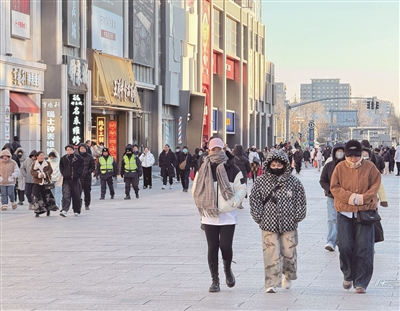 昨天,在冷空气的影响下,北京街头风寒效应明显,今晨为本次寒潮过程中的气温最低值。气象部门提示公众出行注意防寒保暖。图为昨日王府井步行街上,帽子、围脖“全副武装”的市民游客。