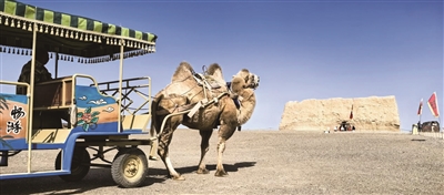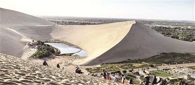 沿着河西走廊行进,满眼是金黄璀璨的沙漠,仿佛置身金色的海洋。在金灿灿的金字塔形沙丘的怀抱中,静静沉睡着一潭月牙般的清澈河水——千年不涸的月牙泉,山与泉相映的鸣沙山、月牙泉遂成为了享誉世界的沙漠奇观。成群结队的骆驼大军载着游人在炎热的沙海里行走,身着各种民族服饰的游客点缀其间,直升机和滑翔机翱翔于湛蓝的天空。此番景象,我不禁吟诵了一首小诗:炎炎鸣沙山,青青月牙泉。悠悠驼铃响,茫茫戈壁滩。