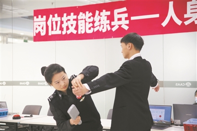 12月16日,首都机场安保公司工会组织开展“冲刺收官,安全护航”岗位技能练兵对抗赛。本次竞赛围绕岁末年初安全生产重点任务,以赛促训,着力锻造高素质专业化安保队伍,为旅客安全顺畅出行奠定坚实基础。图为参赛队员在人身检查项目中的精彩瞬间。