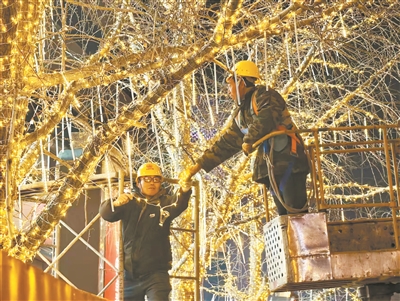 记者昨天在新世界商区看到,工人正在加紧进行彩灯布置,一串串彩灯将道路两旁的树木装点得亮丽而喜庆。在新年即将到来之际,京城各商区张灯结彩,大街小巷处处洋溢着节日的氛围。