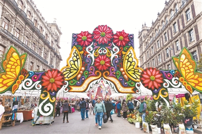 近日,在墨西哥首都墨西哥城,人们走过宪法广场附近的节日装饰。伴随2026年的到来,墨西哥城多地装点节日装饰,洋溢着新年的喜庆气氛。新华社发