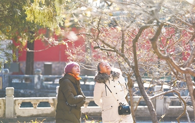 深冬时节,北京卧佛寺内的腊梅迎寒绽放,与红墙古寺相映成趣,吸引游人寻香而至。图为游人在北京卧佛寺观赏腊梅。