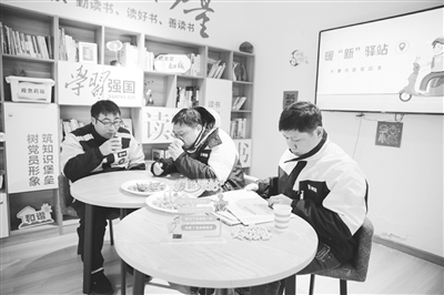 近日,在江苏省如皋市如城街道长巷社区,户外工作者在暖心驿站歇脚。如皋市如城街道依托社区服务大厅、邻里之家建成的暖心驿站实现全域覆盖,为户外劳动者打造了冬日“避风港”。(1月13日《江海晚报》)