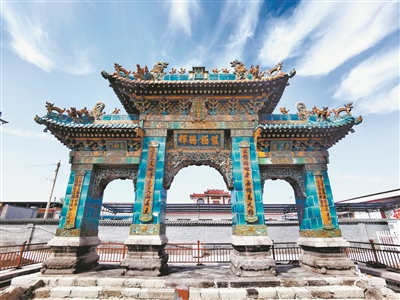 1897年,时年56岁的冀以和在补修村内庙宇时,他在真武庙中轴线之山门前新建了这座琉璃牌坊。听说当年工匠们在现场搭建起琉璃窑,根据设计理念现场烧制、现场建造,每一个构件都独家定制、无不讲究,牌楼柱头、柱底都使用琉璃表现出不同的花卉、寿山、瑞兽和八卦图样,无一雷同。琉璃牌楼共耗资12万白银,可谓“用真金白银”打造。2006年,这里被国务院公布为第六批全国重点文物保护单位。