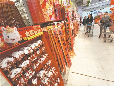随着春节临近,京城各商家浓郁的新春气氛扑面而来。记者昨天在各大超市看到,马元素的春联礼盒、潮玩年品礼盒以及春联、福字、窗花、红包、挂件、红灯笼、中国结等众多年节装饰好物吸引市民前来选购,将迎新春气氛点缀得红红火火。本报记者 孙妍 摄影报道