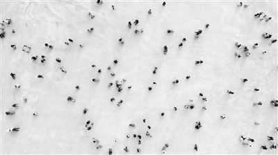 近日,宁夏银川市出现持续降温天气,市民纷纷外出体验冰雪文旅项目,享受“塞上湖城”的冰雪乐趣。图为市民在银川文旅集团览山公园落日冰场玩耍(无人机照片)。新华社发
