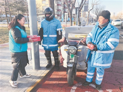 在通州区玉桥中路,通州京环环境服务有限公司三中心四大队的环卫工人们正在打扫落叶,玉桥街道总工会的工作人员为他们及时送来了保温杯、暖宝宝等慰问物资。环卫职工们感动地说:“天气虽然寒冷,但是有了‘娘家人’的照护,我们的干劲更足了。”
