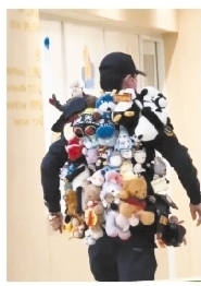 在辽宁省大连市儿童医院,你会看到一位全身挂满玩偶的保安。这位“玩具保安”的身上总是挂满了各种各样的玩偶。每当遇到有孩子哭闹,他总会上前递上一个小玩偶,耐心地哄他们开心。这位保安叫于晶景。“虽然我不会治病,但希望能为孩子们减轻一点痛苦。”于晶景说。(新闻及图片来自新华每日电讯微信公众号)