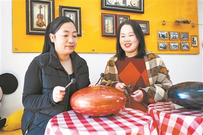 色空鼓教学以其绚丽外观和空灵音色吸引了众多职工群众的参与,青、粉、紫等不同色彩的色空鼓摆放在桌子上,宛如调色盘般亮眼。于明慧手持鼓槌,化身“音乐导师”,从色空鼓的独特构造讲起:“每一面空鼓都是独一无二的艺术品,不同音区能敲出高山流水般的美妙音色……”她最喜欢演奏的是《彩云追月》,空灵悠扬的乐声瞬间将现场每一个人带入艺术氛围。课上,职工们兴致盎然地模仿练习,从最初的生涩到逐渐变得流畅,大家的脸上洋溢着满满的成就感和喜悦。好几位楼宇企业的职工表示:“以前见过色空鼓表演,没想到今天能亲自学习展示,太美妙太有意思了。”“色空鼓是传统音乐文化的一部分,学习它有助于了解和传承优秀传统文化。色空鼓的音色空灵、纯净,学习演奏色空鼓可以提升艺术修养,同时还可以促进身心健康,给大家提供相识相知的平台……”于明慧说。