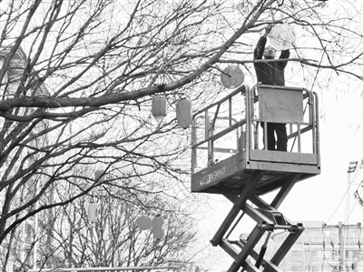 昨天,工人们正在对厂甸庙会及周边街道进行景观布置,红灯笼将琉璃厂文化街装点得年味十足。据悉,作为距离中轴线最近的厂甸庙会将充分突出“文市”特色,书市、年画展主打传统文化消费体验。