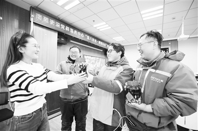 近日,丰台区南苑街道党群服务中心举办腊八节主题活动,吸引区域外卖配送员、快递员等新就业形态劳动者参与。活动现场,大家一同动手泡制腊八蒜。在制作间隙,工作人员还深入了解新就业形态劳动者的工作生活状况和实际需求,并介绍了党群服务中心能为他们提供的各类服务,如休息饮水、应急充电、法律咨询、技能培训等。