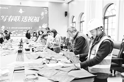 近日,上海宝山站站房2标项目工地暖意融融,上海宝冶工会在此开展“写春联、送祝福”主题活动,邀请书法协会成员、学校及青少年活动中心老师,与职工艺术家、农民工兄弟共同执笔挥毫,让工地满溢家的温情与节日的喜悦。活动现场,工友们围拢一旁,驻足欣赏,挑选自己心仪的春联。(1月26日《劳动报》)