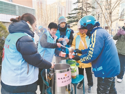 活动当天,志愿者们早早忙碌起来,将熬制好的八宝粥盛入保温桶中,搭配着寓意吉祥的“福”字送到新就业形态劳动者和职工群众手中。在配送站点外,梁会兰为骑手们盛上八宝粥,“你们辛苦了,喝碗热粥暖暖身子。”站点内,骑手们与志愿服务队的工作人员拉起家常。工作人员耐心倾听,不时询问骑手们冬季配送的保暖措施是否到位,反复叮嘱大家出行要注意交通安全。盒马配送站点负责人说:“感谢街道总工会一直以来对一线配送人员的关怀,一碗热粥不仅温暖了肠胃,更凝聚了人心,让我们在忙碌的工作中感受到‘家’的温馨。”