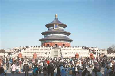 昨天,京城暖阳高照,寒假出游热度攀升。记者在天坛公园看到,游人如织,祈年殿周边游客络绎不绝,市民与游客拍照赏景、休闲漫步。