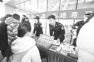 昨天,北京市天康戒毒康复所联合北京市公安局朝阳分局禁毒支队、北京铁路公安局北京公安处共同启动“禁毒护航新春 平安伴您同行”专项宣传活动。此次活动设在朝阳站候车大厅,通过悬挂横幅、摆放展板、展示“奶茶杯”等新型毒品仿真模型,并在车厢内打造移动“禁毒科普课堂”,将禁毒宣传融入旅客出行全程。本报记者 孙妍 摄影报道