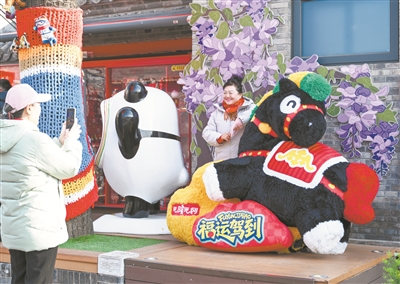 在烂缦胡同中, “马到成功”主题装置、卡通“拍拍马”、马年合拍相框、创意“毛衣树”等以“马”为主题的新年装饰一一映入眼帘,一些店铺、居民的门口纷纷挂起灯笼、贴上了福字,浓浓年味弥漫在胡同中。